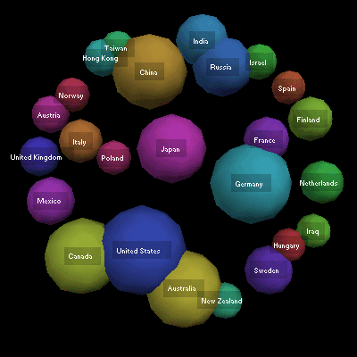 Physical distances are not the same as psychological distances. Physical distances are easy enough to measure, but how do we go about measuring psychological distances? The Mapped Web does this by taking the chance that given a page contains the name of one country it will also contain the name of another country as a measure for psychological distance. The resulting images show us how close countries are to each other in psychological terms.