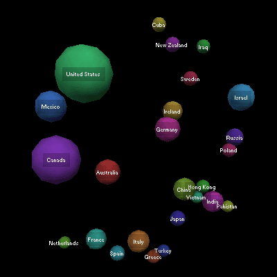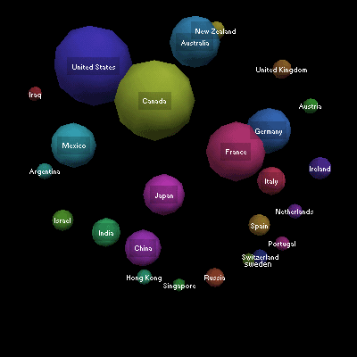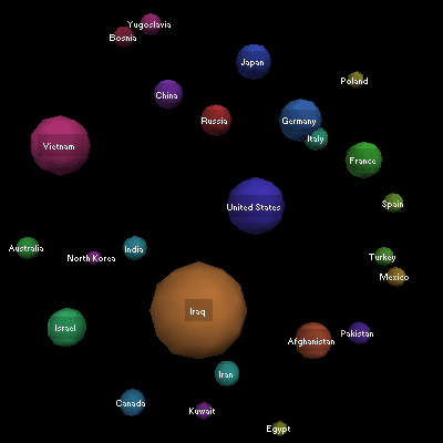 This procedure can be extended to create maps for specific areas by including extra search terms. Look at all the pages on the Internet with the word War on them, which countries correlate? Probably countries that have something to do with each other in wars. The images below picture some of the relations between countries in this way.
