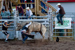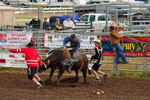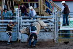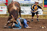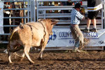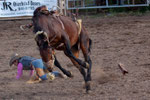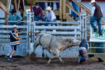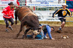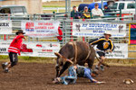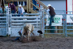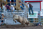 Hier sitzt der Reiter auf einem wilden Stier. Dies ist das gefährlichste Rodeo überhaupt. Auch hier muss er mindestens 8 Sekunden oben bleiben und die eine Hand darf den Bullen nicht berühren um überhaupt in die Wertung zu kommen. Die Schläge auf Rücken und Wirbelsäule sind immens. Zwei (auffällig gekleidete) „bull fighting clowns“ sind mit in der Arena um den Bullen nach dem Sturz des Reiters ab zu lenken. Ansonsten würde der Reiter nicht überleben. Trotzdem kommt es immer wieder zu Verletzungen. So auch in diesem Rodeo. Die Bilder sagen alles!!