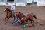 Zwei Cowboys fangen einen Stier in dem sie in einholen und dann einer sich im fliegenden Galopp auf den Stier wirft und in an den Hörnern fasst. Im vollen Galopp versucht er in nieder zu ringen. Ein ziemlich gefährliches Unterfangen.