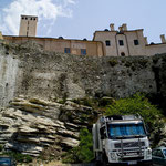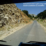 Eine unbefestigte, einspurige Straße führte stetig bergauf. Wenn ein Auto entgegen kam, war das im wahrsten Sinne Millimeterarbeit. Rechts der mehrere hundert Meter tiefe Abgrund, links der Spiegel des anderen Fahrzeuges. Aber der Ausblick spektakulär. Wilde schroffe Berge, dazwischen bis in die höchsten Lagen Weingärten. Am Straßenrand blühende Büsche, schlanke Zypressen und schattenspendende Pinien.