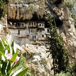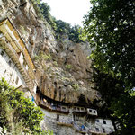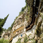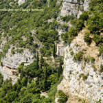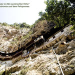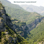Diese Fahrt war die bisher spektakulärste die wir jemals gesehen haben. Deshalb hier noch die genaue Beschreibung falls sie jemand nachfahren möchte. Ein Teil der Strasse war für unseren Volvo absolut grenzwertig. Von Andritsena die #76 Richtung Megapoli bis nach Karitena, hier links abbiegen und Beschilderung Gortis folgen bis nach Gortis. Von hier zum Kloster Prodromou und dann nach Dimitsana. Die Strecke bis Karitena geht teilweise hoch oben über der Alfios Schlucht mit herrlichen Ausblicken. Karitena liegt wunderschön über der Alfios Schlucht auf einem Bergrücken. Gortis ist eine Antike Ausgrabung direkt am eiskalten Lousios Fluss (im Sommer kalt aber wenig Wasser). Hinter Gortis beginnt die tiefeingegrabene Lousios Schlucht an der einige Klöster sich befinden. Wir haben das wunderbar gelegene Kloster Prodromou besucht. Der Wohnkomplex klebt wie Schwalbennester an einer Felswand. Oberhalb des Klosters liegt eine Kapelle direkt über dem Abgrund zur Schlucht (einige hundert Meter tief). Das Kloster selbst ist nur über einen Eselsweg erreichbar.