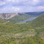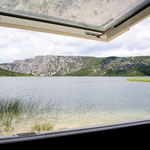 Wir wollten am Stausee (Perucko Jezero) des Flusses Cetina (die hier entspringt) übernachten. Die Strasse führt am Südufer entlang und die Landschaft ist herrlich - aber keine Möglichkeit ans Wasser zu kommen. Erst ganz am Ende des Sees sahen wir von oben ein Strässchen ans Wasser - da gab es kein halten mehr und wir waren da. Ein Traumplatz ganz für uns alleine (nur ein paar Angler und ein junges Liebespäarchen).