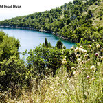 Besonderes: Wir haben ganz bewusst nicht die Hauptroute gewählt sondern die kleine Nebenstrecke über alle kleinen Dörfer der Insel. Um es gleich zu sagen die Strecke ist grandios und bisher das Schönste was ich jemals gesehen habe. Bis Vrbanj ist es wunderschönes Kulturland (auf Meereshöhe) mit abwechselndem Weinanbau, Olivenhainen, Lavendelfeldern und Pinienhainen. Der Duft wechselt von süßlichem Jasmin über Lavendel bis ganz herbem Pinienduft. Ab Starigrad geht es dann in Serpetinen steil von Meereshöhe auf 400m und läuft eine Zeitlang dem Grat entlang. Die Vegetation ändert sich völlig. Fast nur noch wildes Buschland immer wieder unterbrochen von Lavendelbüschen und Jasminstauden. Und was ich vorher noch nie gesehen hatte: auch steilste Hänge sind übersäht mit Trockensteinmauern (aus dem 16. Jahrhundert). Unzählig viele Terrassen - sieht aus wie Labyrinthe oder Schachbretter oder chinesiche Reisfelder - unglaublich schön und dann noch die Aussicht auf die Berge eingerahmt vom tiefblauen Meer und die sagenhaften Gerüche. Ein Rausch an Farben, Formen, Gerüche.
