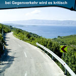 Am 26. 5. sind wir über Gospic nach Karlobag ans Meer gefahren. Die Stecke ist eine Ost-West Verbindung von der Bosnischen Grenze an die Adria und durchläuft zwei völlig unterschiedliche Vegetationen (bis zum Gebirgskamm des Velebit Massivs mitteleuropäisch - ganz grün und stark bewaldet und dann mediteran mit wenig Gras und Busch und vielen weißen Felsen. Die Strecke führt von 550m in Plitvice auf 980m im Velebitübergang und dann relativ schnell runter auf Meereshöhe. Sie ist einmalig schön und man kommt km für km aus dem Staunen nicht raus. Die Steile Abfahrt und die vielen Serpentinen waren mit dem Volvo hervorragend zu fahren. Die starke Motorbremse ist ein Genuß und der gute Überblick ist einfach nur schön.