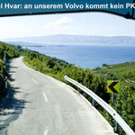 In Hvar wollten wir eine „eigene“ ruhige und schöne Bucht suchen. Nach 10 km von Sucuraj fuhren wir eine kleines geteertes Sträßchen Richtung Meer. Kurz bevor es steil zum Wasser runter ging war es nur noch eine Schotterstrasse und ein für uns unleserliches Schild deutete eine Privatstrasse an. Wir erkundigten uns zu Fuß. Das Ufer war zugebaut mit häßlichen Häusern und es gab Touristen aber keinen Stellplatz. Also enttäuscht und schweißtreibend wieder hoch und weiter Richtung Starigrad. Die Hauptstrasse (es gibt auf Hvar eigentlich nur eine Strasse) ist dermassen schmal dass ich jedes mal anhalten musste wenn jemand entgegen kam. Es wurde steiler und die Strasse fiel direkt am Rand oft 1m (in den steileren Gegenden auch manchmal 10m) senkrecht nach unten. Abkommen von der Strasse wäre das Ende für das Fahrzeug gewesen.