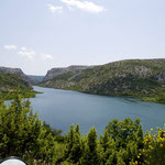 Die Stecke von Skradin nach Norden zur Insel Visovac ist landschaftlich wunderschön. Berge und Hochebene. Diese Hochebene ist praktisch nicht genutzt - ausschließlich wildes Buschwerk und Dornen. Wir haben dann die Krka bei den Wasserfällen Roski Slap überquert. Die Strecke ist als besonders schön in der Karte gekennzeichnet - was absolut stimmt. Man braucht nur die Bilder aus den Karl May Filmen abrufen. Eine enge Strasse führt zum Fluss und dann 20m (an der engsten Stelle mit senkrechten Felsen nach oben und senkrecht nach unten) steht ein kleines Schild: max. 5 to und max. Breite 2,20m.