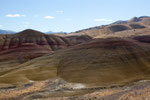 Die wunderbare Strecke geht weiter über Service Creek. Hier sind wir nach Süden gefahren HWY 207) weil wir die „Painted Hills“ sehen wollten (bei Mitchell). Diese Berge sind einmalig weltweit. Ehemaliges Vulkangestein in den Farben Rot, weiß, gelb, schwarz - und dies gemischt wie es keinem Künstler gelungen wäre. Das Material ist weich und porös dass man glaubt beim nächsten Regen würde alles weggespült. Aber sobald es nass wird verändert sich die Oberfläche und wird glatt und fest. Diese Hügel sind alle 30 Millionen Jahre alt.