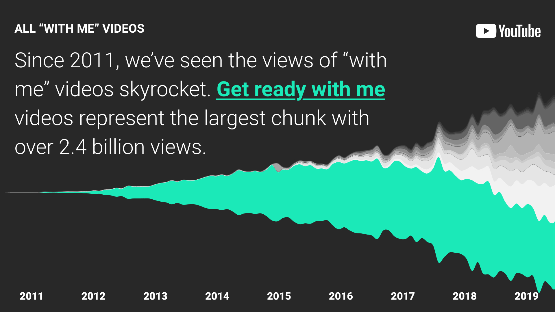 The earliest “with me” videos evolved from within the burgeoning beauty community around 2010. These “get ready with me” videos were essentially long-form tutorials set to music, during which people performed their daily makeup routines from start to finish, sped up to make them more digestible. By 2011, people had begun talking during their “get ready with me” videos, and “get ready with me” videos began to morph from tutorial to vehicle for creators to converse with audiences.